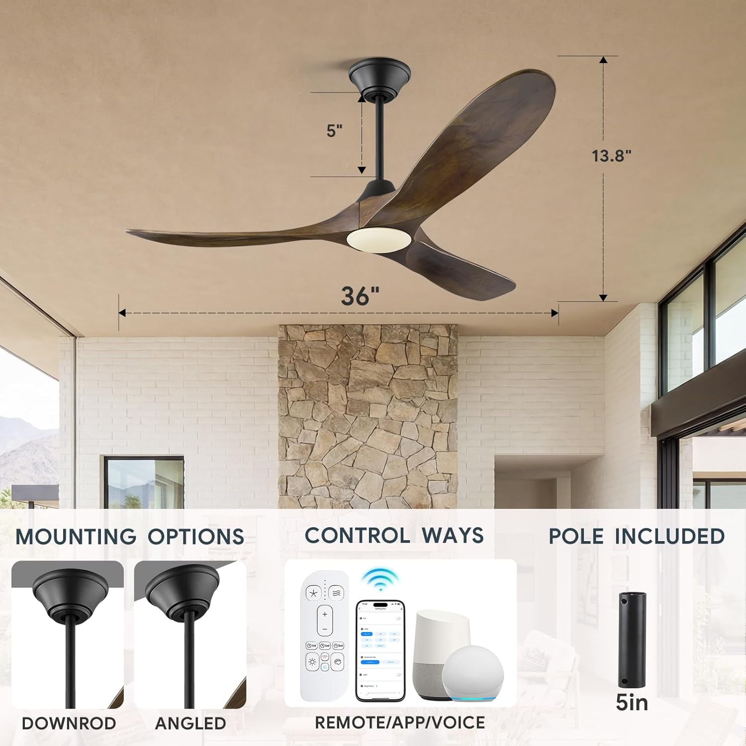 | Special Features | 3 Blades Wood Propeller Ceiling Fan for Indoor Outdoor, Damp-Rated, Flush or Angled Mount Low-Profile Ceiling Fan, Flicker-Free, 3-Color Temperature & Fully Dimmable Ceiling Fan with Light, Reversible DC Motor, Ultra-Quiet (<35 dB) Energy-Saving Ceiling Fan,1/4/8H Timing, Solid Walnut Wood Smart Ceiling Fan controlled via Alexa/Google Assistant, Tuya Smart App, Multifunction Remote |