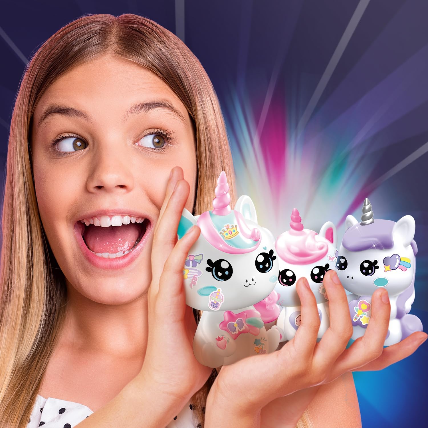 Decorate the whole family with stickers and rhinestones! One adult unicorn and two baby unicorns are included. Magical, babies glow in the dark! Turn on the Unicorn Mom, it diffuses a soft multi-coloured light.