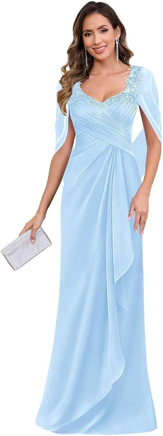 | Embellishment Feature | Chiffon Mother of The Bride Dresses for Wedding with Cape Sleeve Lace Formal Evening Gown, Mother of The Bride Dresses for Wedding Lace Chiffon Formal Evening Party Dress with Cape |