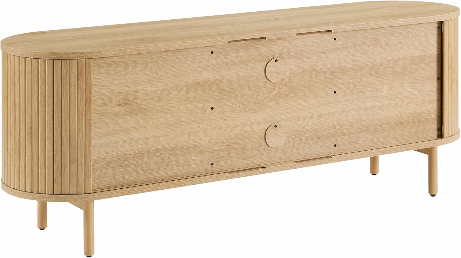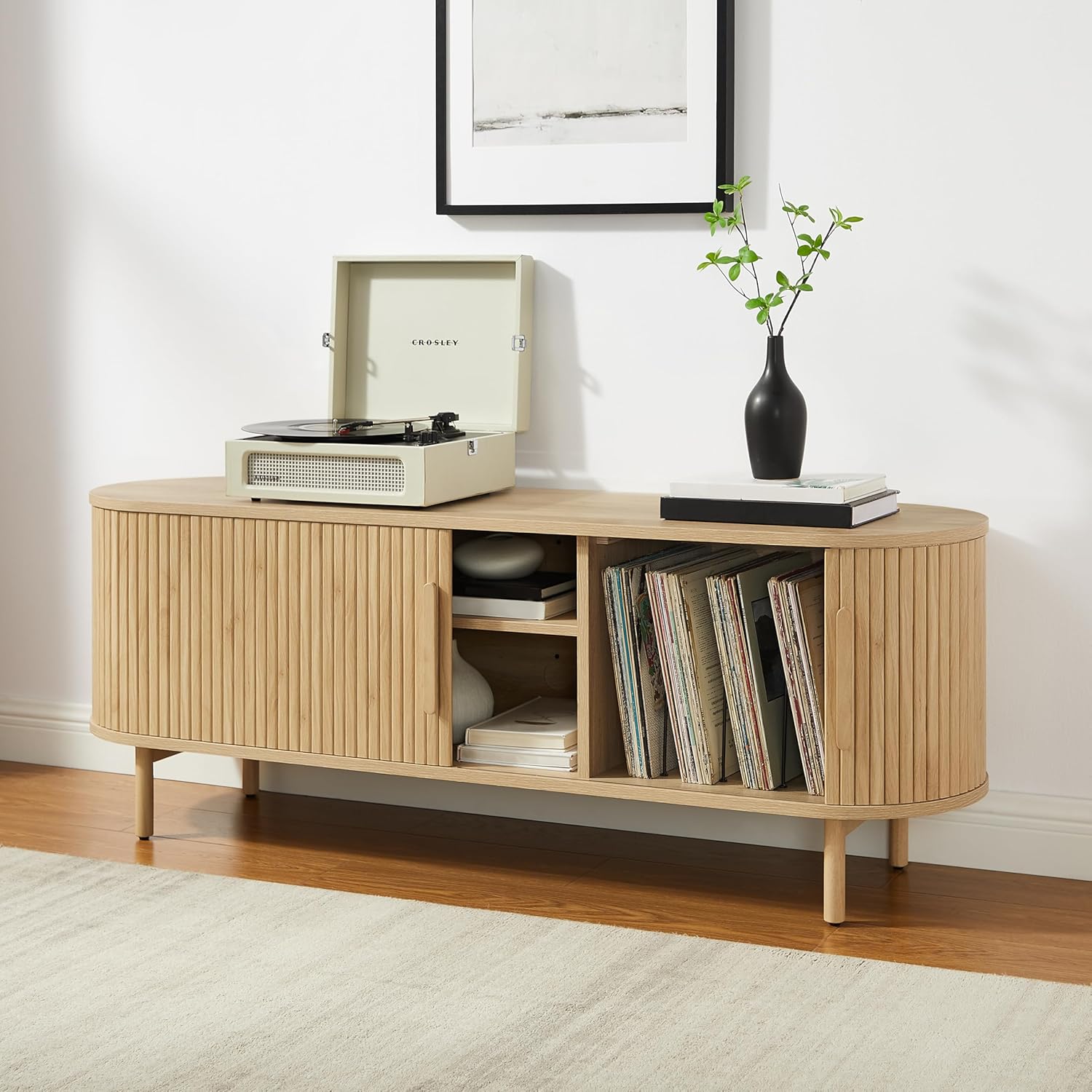 The Ambrose Record Storage Media Console seamlessly blends organic design with modern functionality. Featuring fluted sliding tambour doors and bold wood handles, it makes a striking statement in any space. The media stand has two side cabinets that each hold up to 60 records, along with a center compartment equipped with an adjustable shelf for audio equipment. Tech-ready with dual cable cutouts, this turntable stand with storage is a perfect union of form and function.