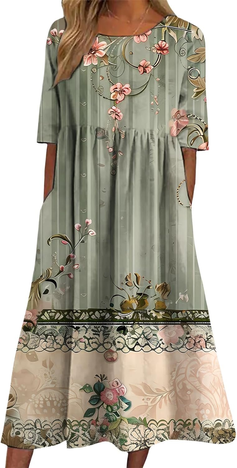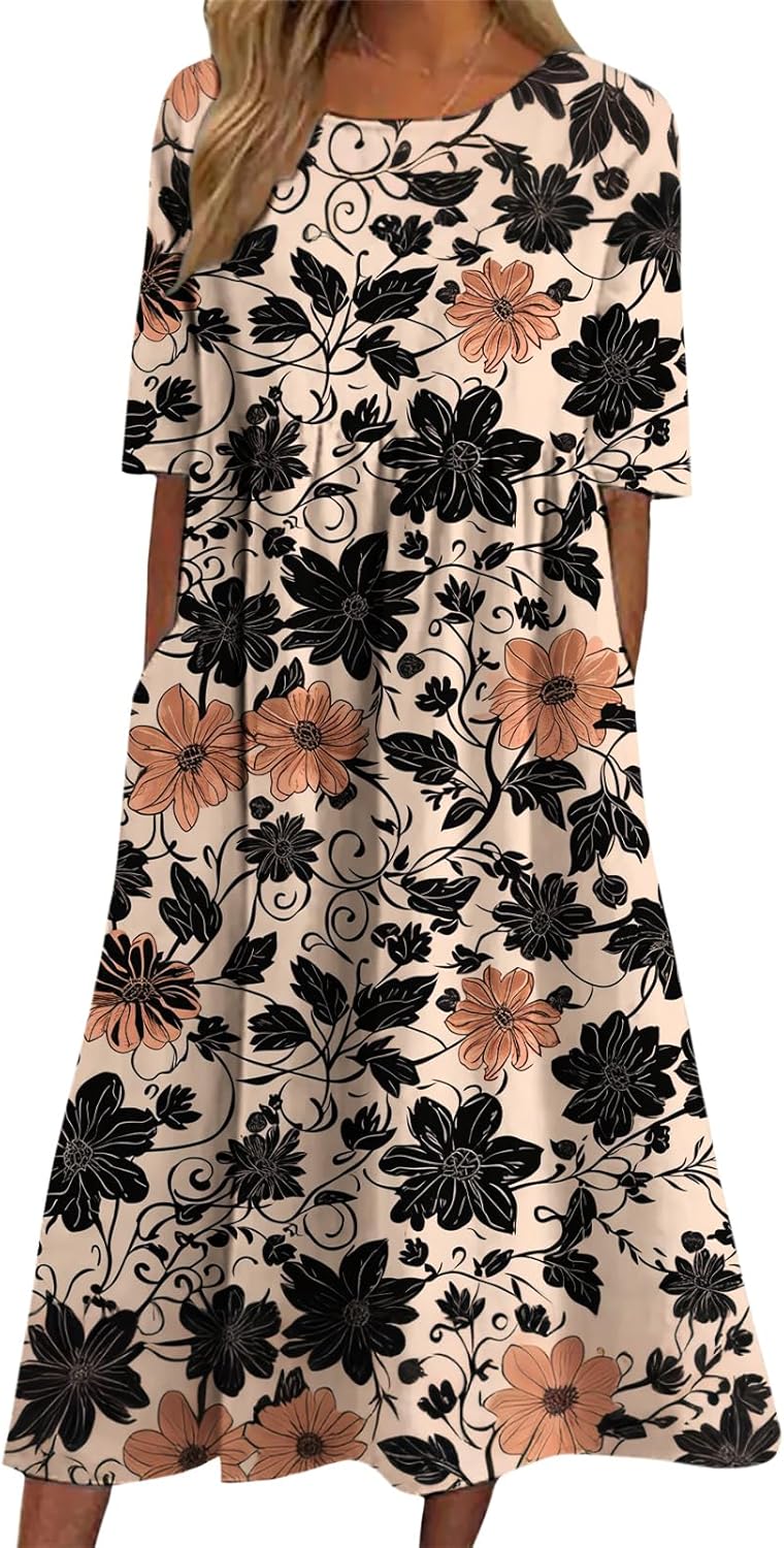Dresses for Women Summer Fashion Floral Maxi Dress Casual Crew Neck Short Sleeve Loose Dress with Pockets
