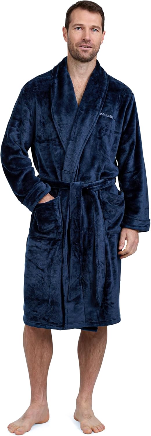 Everyday Luxury Experience the ultimate in downtime comfort with the Eddie Bauer mens bathrobes. Whether you are stepping out of the shower or settling in for a movie night, this bathrobe delivers the warmth you need without the heavy bulk. The premium men's robe fleece fabric feels soft against the skin, making it an essential upgrade to your morning and evening routines. Designed for Warmth When the temperature drops, this bathroom robe keeps you cozy. The traditional shawl collar acts as a built-in scarf, protecting your neck from drafts, while the long cut provides ample coverage. It is the perfect winter layer for brewing coffee or reading the paper on a lazy Sunday. Functional & Stylish Beyond comfort, this robe is built for real life. The adjustable belt ensures it stays securely in place, and the two roomy pockets offer convenient spots for your phone or glasses. Finished with the classic Eddie Bauer logo, it combines rugged quality with refined style, making it an excellent gift for the man who values relaxation.