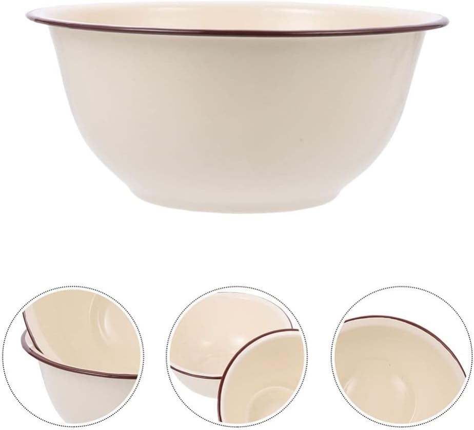 DescriptionEnamel Bowl, Kitchen Round Soup Bowl Enamel Mixing Bowl Thicken Foods Soup Bowl Salad Serving Bowl, Distressed Black RimFeaturesColor: Material:Enamel- Size: 19.50X19.50X8.50cm/7.66X7.66X3.34in -The Enamel Bowl for cooking has a large capacity, so you don't have to worry about splashing when you stir it.-Adoption of simple and convenient design, Retro Enamel Bowl can bring much convenience to you.-It has a wide range of uses and can be for storing salads, or washing fruits, -The thickened enamel basin designed with beautiful color, features traditional Chinese style.-Enamel Bowl can be given as a gift to your friends, the special design make it a meaningful gift.- Color: .- Size: 19.5X19.5X8.5CM.Package Including1 x Enamel Bowl