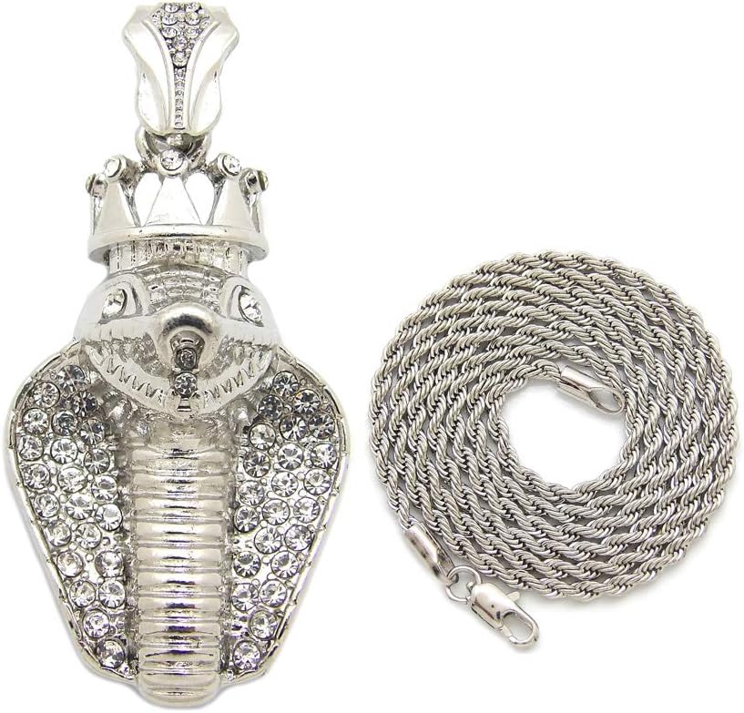 Unisex Iced Out King Crowned Cobra Snake Pendant 24" Various Chain Necklace in Gold, Silver Tone