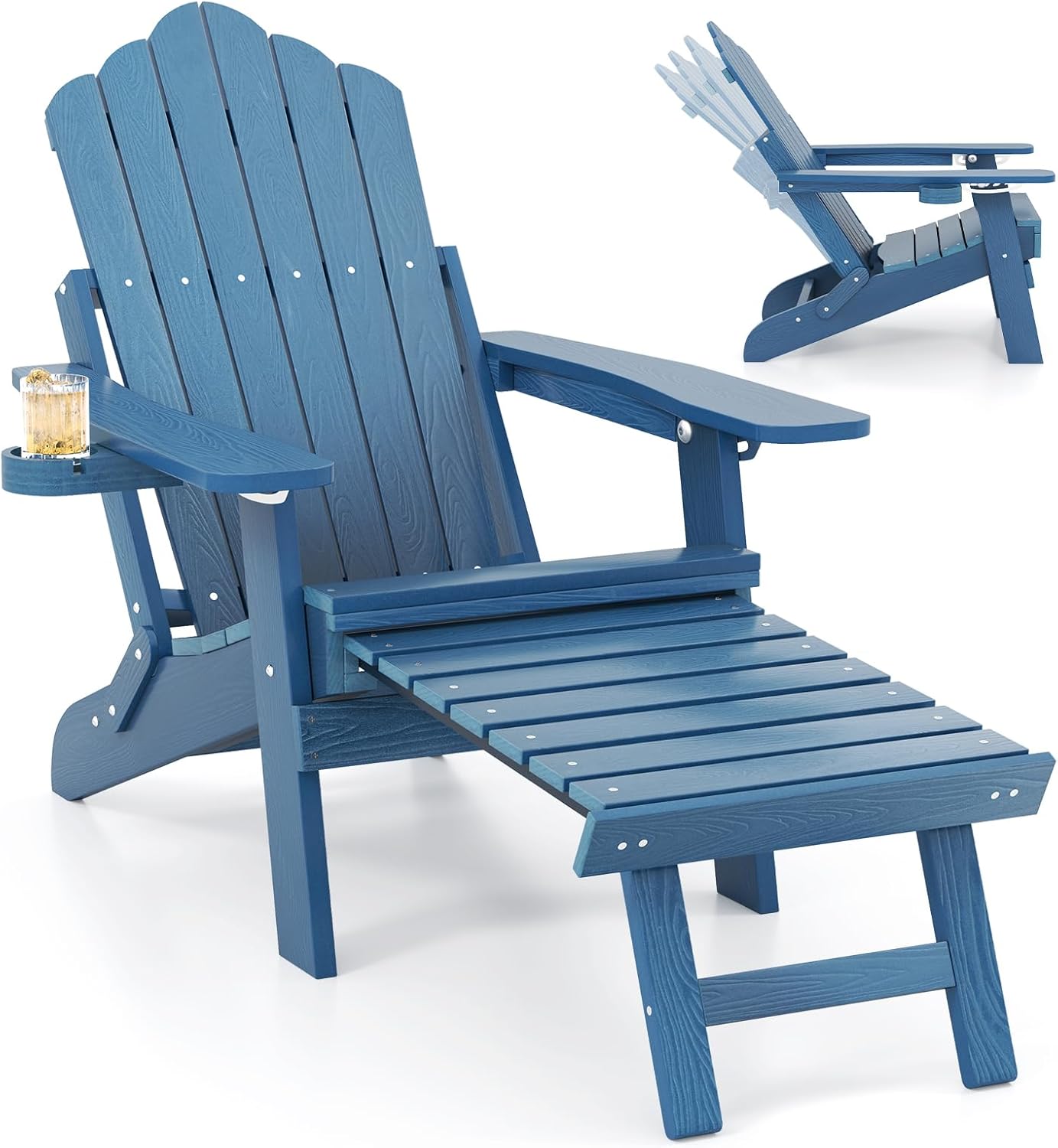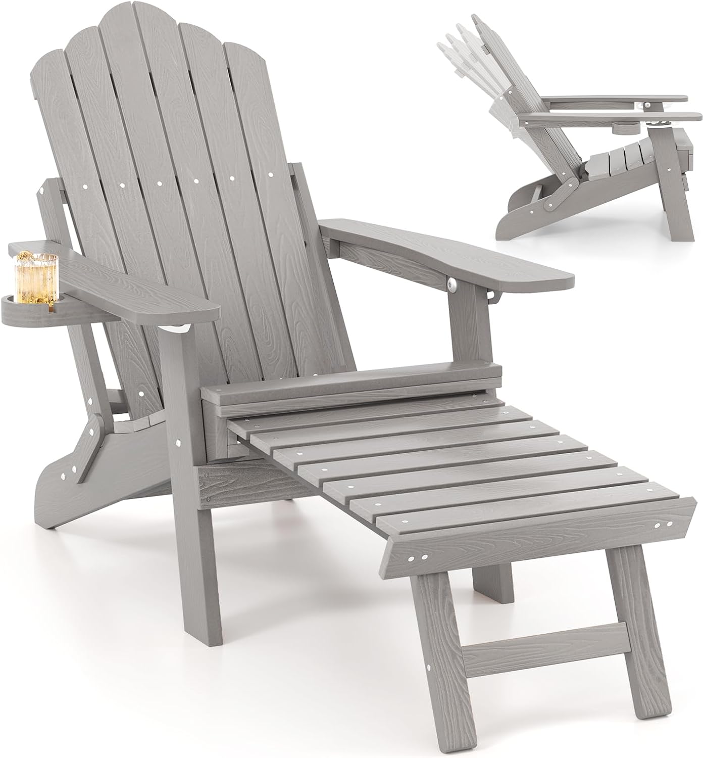 Description: Elevate your outdoor experience with this ergonomic and robust Adirondack chair, thoughtfully designed to meet all your lounging needs. This Adirondack lounge chair offers a 4-level adjustable backrest, making it perfect for comfortable reading, sunbathing, or napping. Constructed from high-quality all-weather HIPS material and reinforced with stainless steel screws, it withstands all weather conditions, ensuring long-lasting durability and minimal maintenance. The cozy seat features a rotating cupholder for your drinks or devices, adding to its functionality. Its quick-folding design and retractable footrest make the oversized lounge chair easy to store and move, saving space. Upgrade your backyard or patio with this stylish and practical patio Adirondack chair, combining comfort and convenience for any home. Features: 4-position adjustable backrest meets your reading, leisure and sunbathing needs Premium HIPS material is weather-resistant, fade-resistant, and easy-to-clean Hidden cup holder provides a secure place to store beverages 5" widened armrests provide added support and comfort Retractable ottoman offers a place to rest your feet Convenient folding design allows for easy storage and transportation Stainless steel screw fixation ensures long-lasting durability Wood texture adds a natural and rustic touch to the overall design Ideal for patio, garden, beach, poolside, etc Assembly is required before use Specifications: Color: Black/Brown/Gray/Navy Material: HIPS, Stainless Steel Overall Dimension (without Footrest): 47 -36" x 30.5" x 32"-38" (L x W x H) Folding Dimension: 47" x 30.5" x 8.5"(L x W x Thickness) Seat Dimension: 20.5" x 18.5" (W x D) Seat Height from the Ground: 15" Footrest Dimension: 18" x 22" (W x D) Weight Capacity: 400 lbs Net Weight: 48 lbs Package Includes: 1 x Folding Adirondack Chair 1 x Instruction