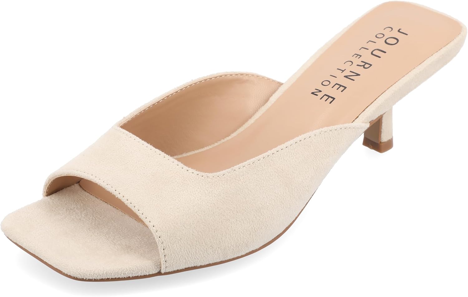 Meet the Larna by Journee, the quintessential kitten heel with a charming open toe. This slip-on style showcases faux suede uppers adorned with a square toe box and heel, creating a retro aesthetic. The design is completed with a padded insole and a tiny 2-inch heel. This slip-on style is destined to become a favorite go-to in your closet. Also available in wide width.