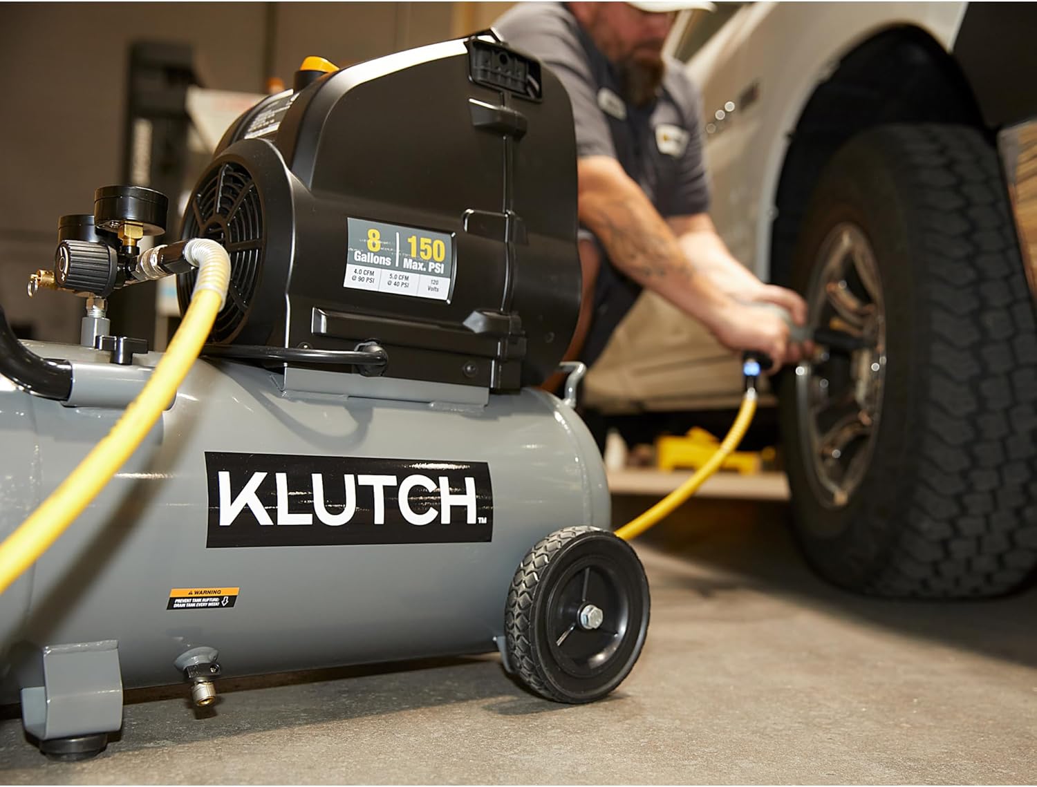 The Klutch 8-Gallon, 150 PSI Oil-Free Hot Dog Air Compressor offers reliable performance with minimal maintenance. Its oil-free pump eliminates the need for frequent upkeep, while the powerful 2 HP motor delivers 4 CFM @ 90 PSI for quick recovery and cycle times. Designed for easy portability, the compressor features wheels and a demountable handle, making it simple to move around. Rubber foot stabilizers help reduce vibration, ensuring a smoother operation. The conveniently located forward-facing drain valve allows for fast and thorough tank draining, while the power cord hook keeps the area tidy. The Klutch 8-Gal. Hot Dog Air Compressor is perfect for users who need consistent air delivery with less hassle.