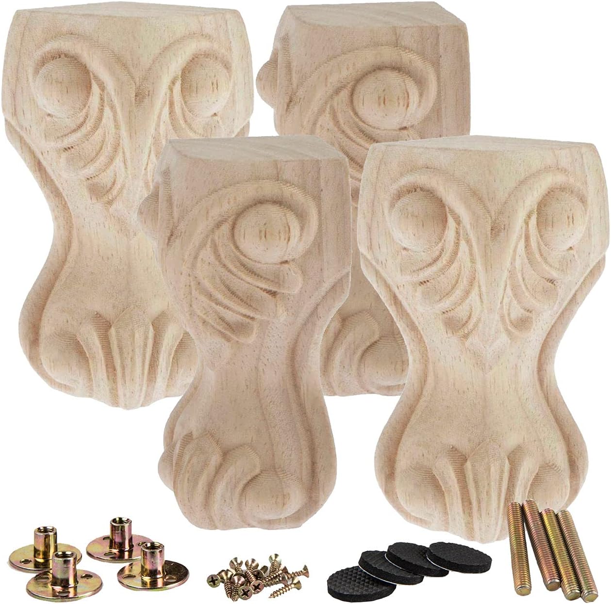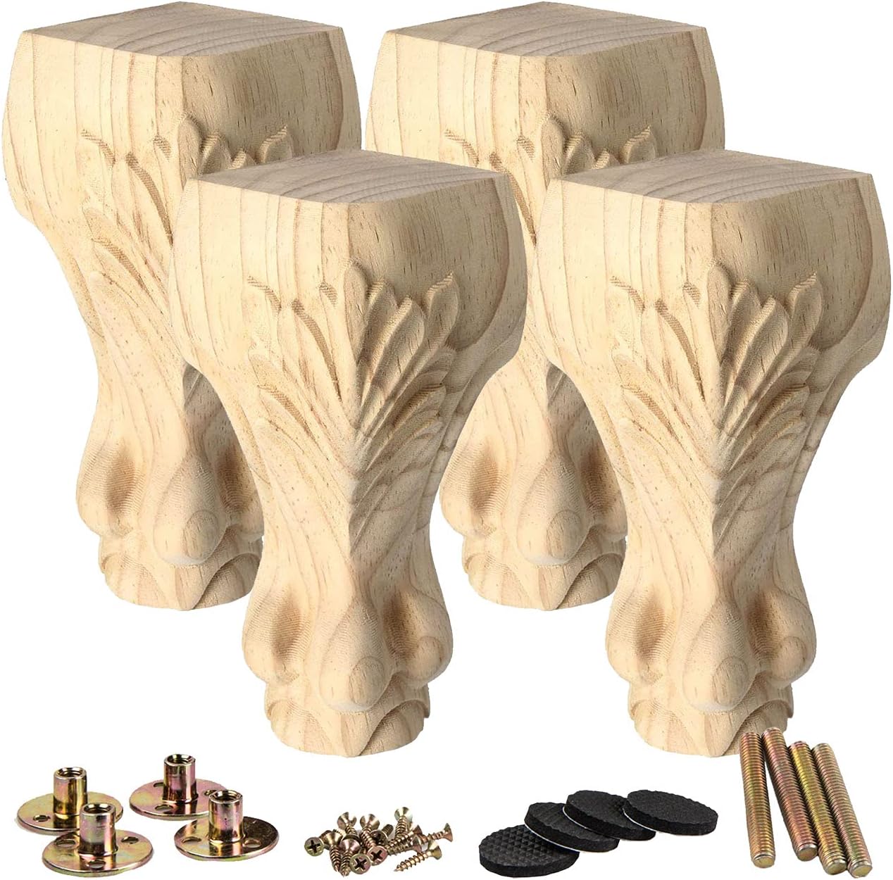 Solid Hardwood Unfinished Furniture Legs - Solid wood carved unfinished legs set of 4 for DIY furniture projects, furniture restoration and furniture height raising projects. - You will have everything ready to get the job down. - Perfect for furniture sofa, table, chair, couch, chest of drawes, cabinet, bed and more! Easy Installation - With this full set of wood furniture legs, all you need to do to get the job done is to pre-drill M8 screw holes, attach the leg mounting plates, and install furniture wood legs. - The stylish design and expertly crafted finish will have people wondering if you bought a whole new furniture set. - Easy installation and universal fit mean that you will have the upgraded furniture ready for use in no time! Specification - Material: Rubber Wood; Note - 1.Due to the natural wood, it is normal that there is a little deviation of item size, pattern and color, thanks for your understanding; - 2.The wooden legs are funiture Replacement only, NOT Handicraft. Due to natural material, it may NOT be 100% perfect, slightly imperfect can NOT be avoided, please understand; Package Included - 4x Wooden Furniture Legs - 4x M8 Bolt - 4x Iron Plates - 4x Floor Protectors - 1x Screw Set