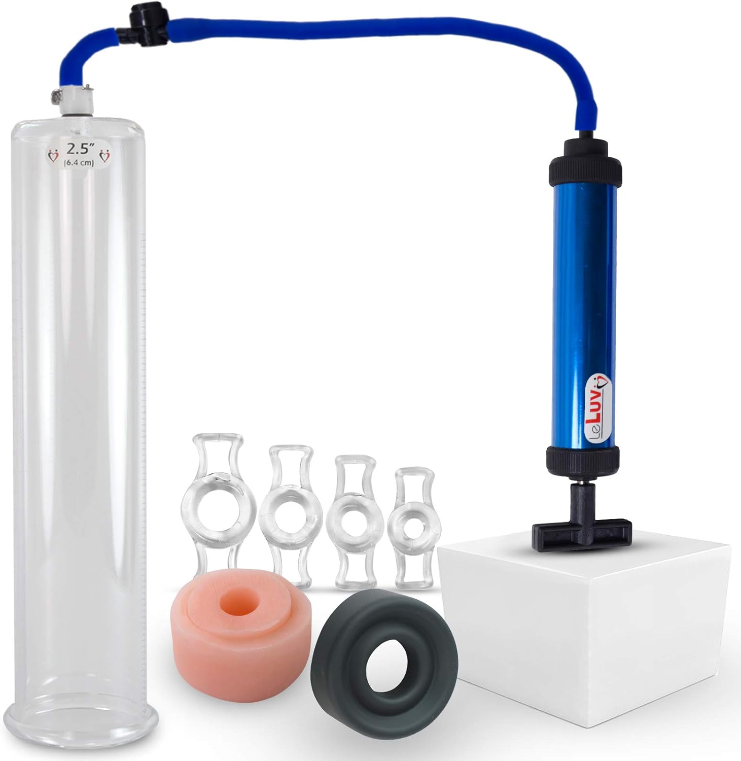 The lightweight aluminum vacuum penis pump creates suction with a manual pumping motion similar to a bicycle pump. Includes a quick-release valve for safe pumping. Simply press the valve to release vacuum if you experience discomfort. The clear, seamless and untapered acrylic cylinder included in this kit has no manufacturing seams along the insertable length, includes the Quick-Disconnect locking female valve, which allows the hose to be disconnected from the cylinder and still retain vacuum. The cylinder has a rounded flange at the base.Constriction Rings:Once the ring is in place, continue using your pump as directed. The Ring will aid in sustaining an erection for a longer period after pumping.Vagina Donut:This super soft sleeve fits pump cylinders from 2" to 2.75" diameters. Its realistic look and feel creates an airtight vacuum seal.Silicone Sleeve:This soft and stretchable TPR sleeve fits most Pump cylinders sized 2.25" to 2.75".