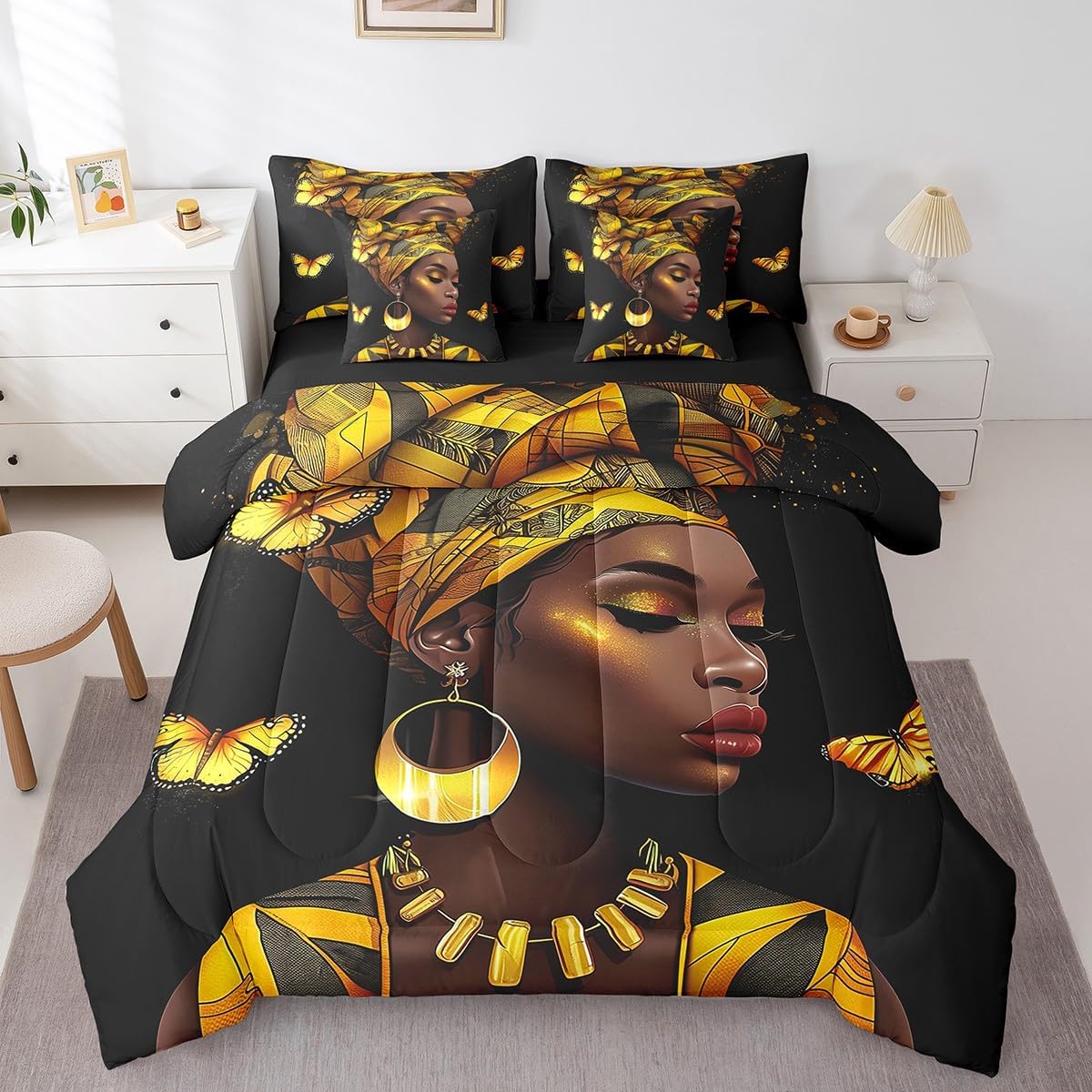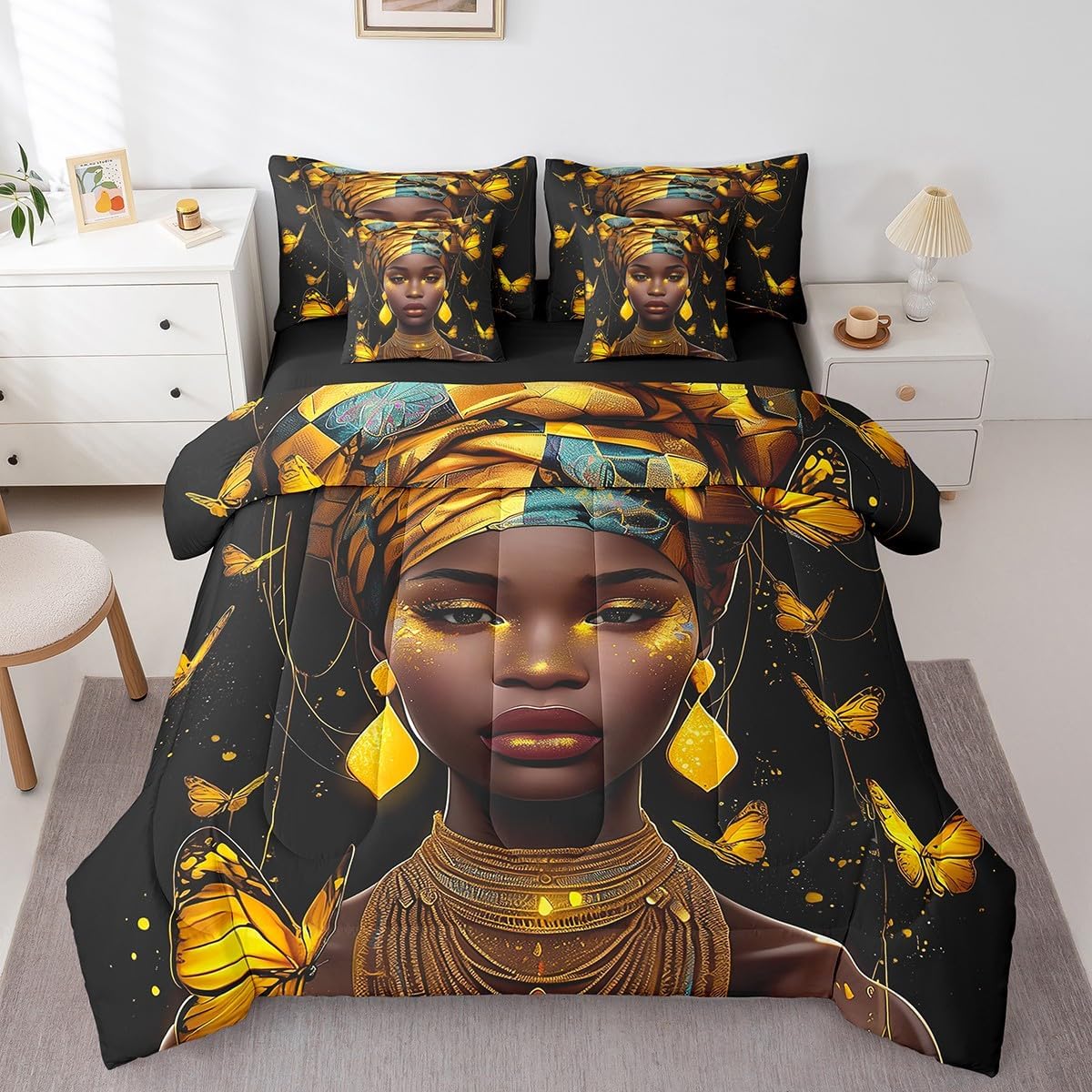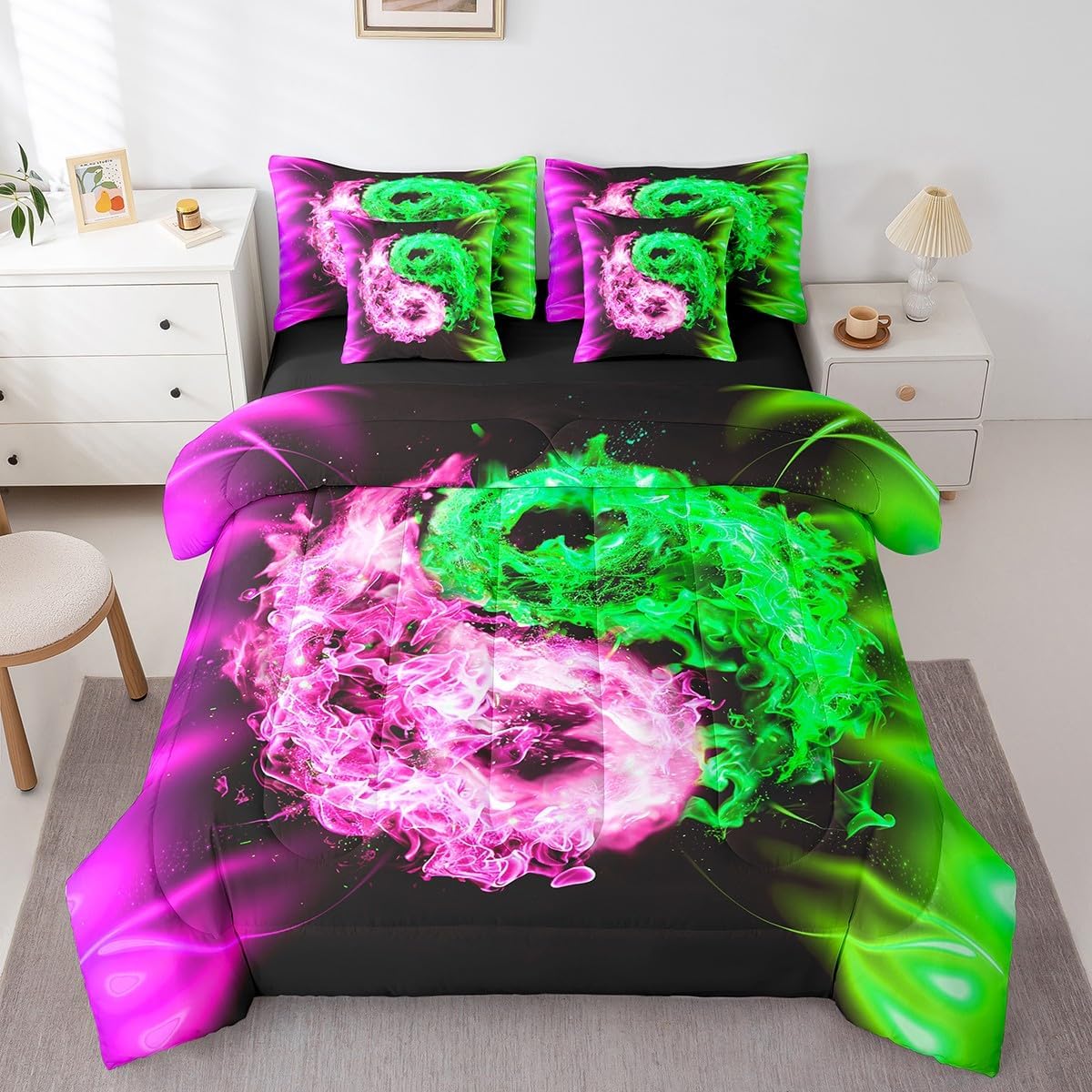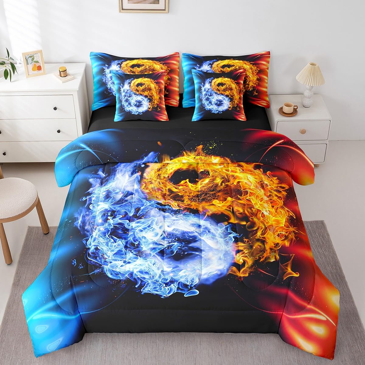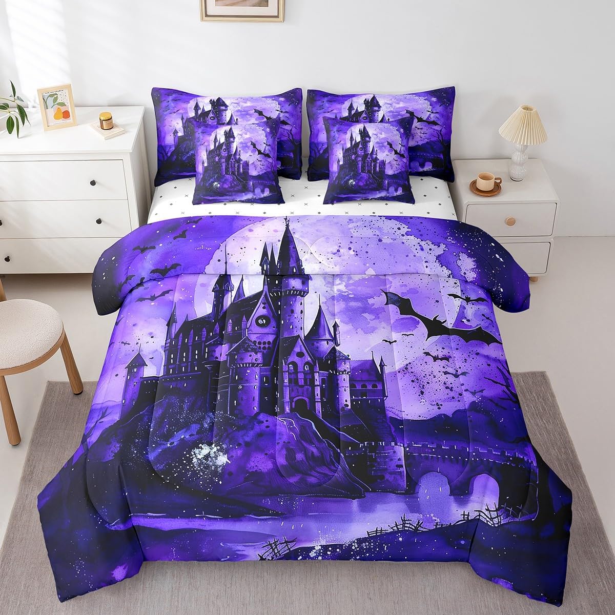 Welcome to our store. We have specialized in home textile for many years. We are contribute to provide the best customer service and products. We'll try our best to answer your questions and solve your problems. Size information: Twin size: 1 Down Comforter 68"W x 90"L, 1 Fitted Sheet 39"W x 75"L x 16"H, 1 Flat Sheet 67"W x 96"L, 2 Pillowcases 20" x 30", 2 Throw Pillow Covers 18" x 18" Full size: 1 Down Comforter 79"W x 90"L, 1 Fitted Sheet 55"W x 75"L x 16"H, 1 Flat Sheet 81"W x 96"L, 2 Pillowcases 20" x 30", 2 Throw Pillow Covers 18" x 18" Queen size: 1 Down Comforter 90"W x 90"L, 1 Fitted Sheet 60"W x 80"L x 16"H, 1 Flat Sheet 90"W x 102"L, 2 Pillowcases 20" x 30", 2 Throw Pillow Covers 18" x 18" King size: 1 Down Comforter 104"W x 90"L, 1 Fitted Sheet 78"W x 80"L x 16"H, 1 Flat Sheet 90"W x 106"L, 2 Pillowcases 20" x 36", 2 Throw Pillow Covers 18" x 18" Useful and practical: A luxurious product for homes,dorm rooms,hotels,guest rooms. Practical to use for being polyester, feels like cotton which is super soft and breathable. No chemicals used, no dye substance harming the health of you or your family. Unique design: Vivid Colors won't fade thanks to new 3D digital printing methods. These unique designs match well with various color palettes of your rugs, curtains, headboard, furniture, and all other decor accessories. Washing instructions: Machine wash separately in cold water,hang dry, do not bleach. Warm Tips: 1. Please allow 1-3cm error due to manual measurement. 2. Actual color may vary from the color on your screen due to monitor color restrictions.