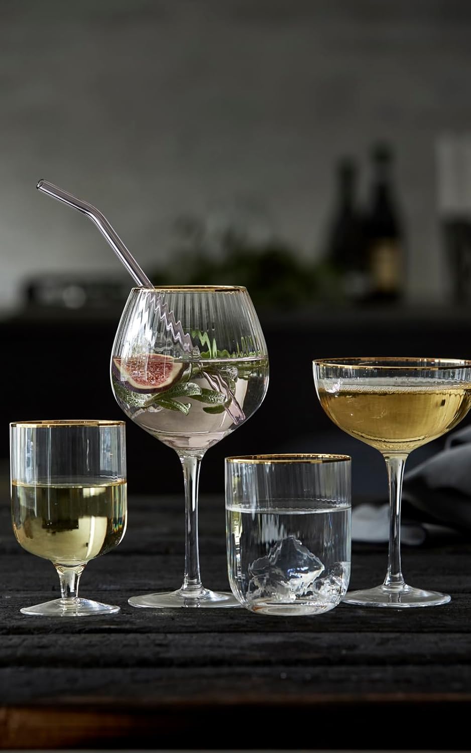 Beautiful cocktail glass with a soft curved silhouette Elegant flute design with excellent gold rims combines current trends and vintage. When you pour your drink, the fine wave surface reflects light beautifully and enhances the elegance of the glass. 315ml, Set of 4