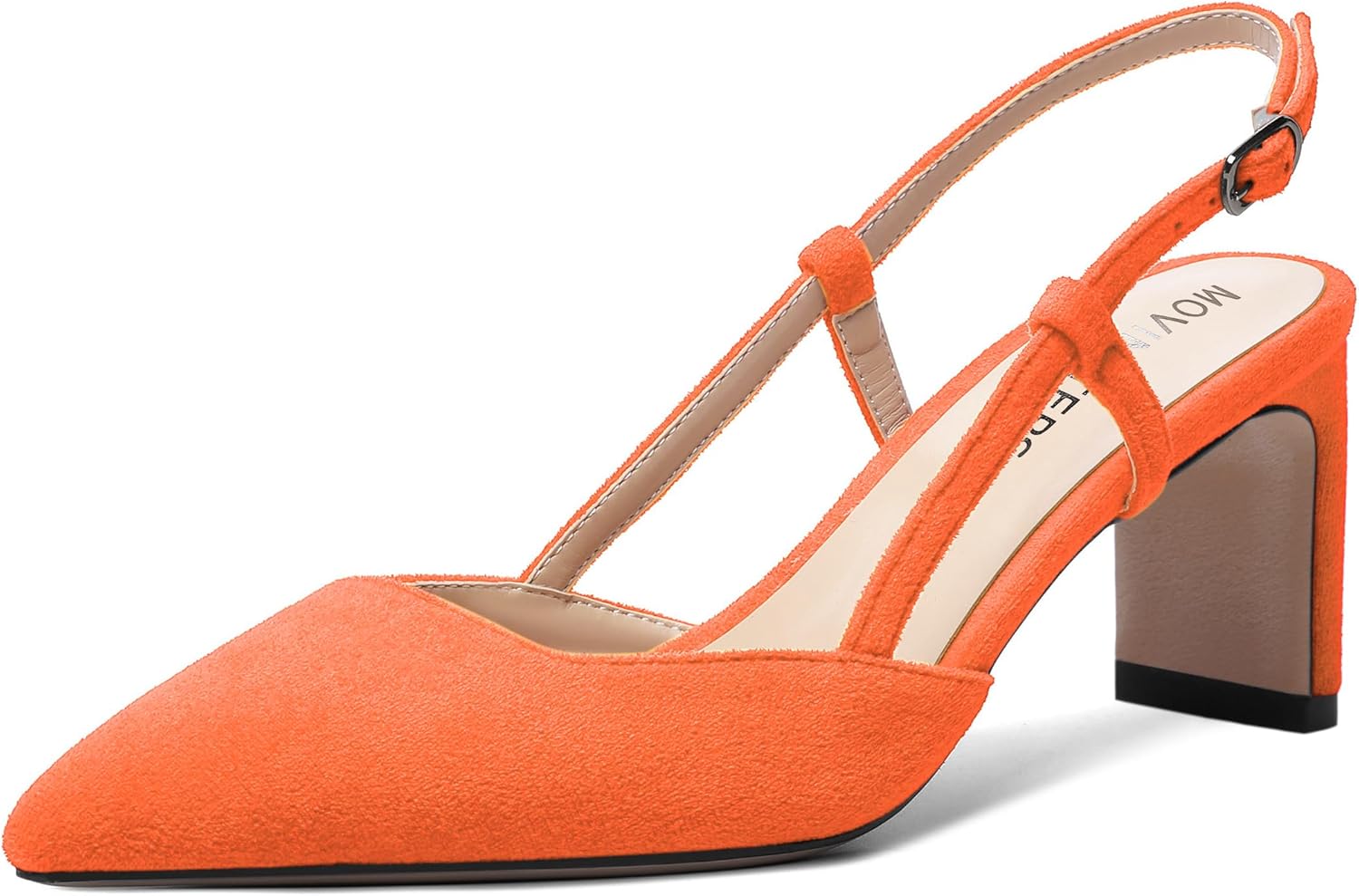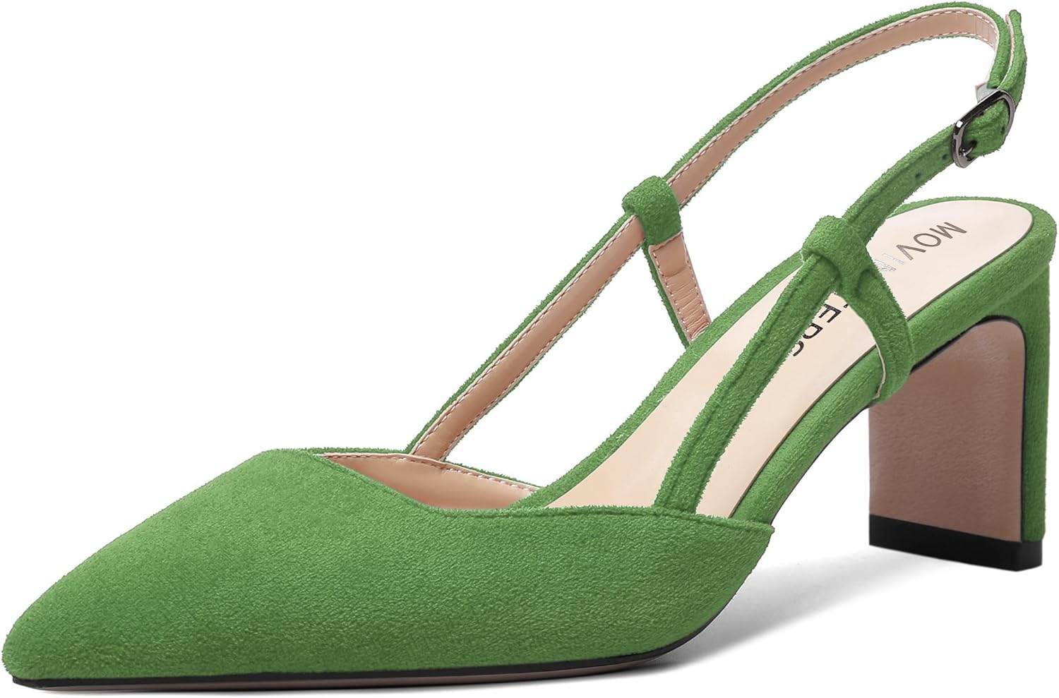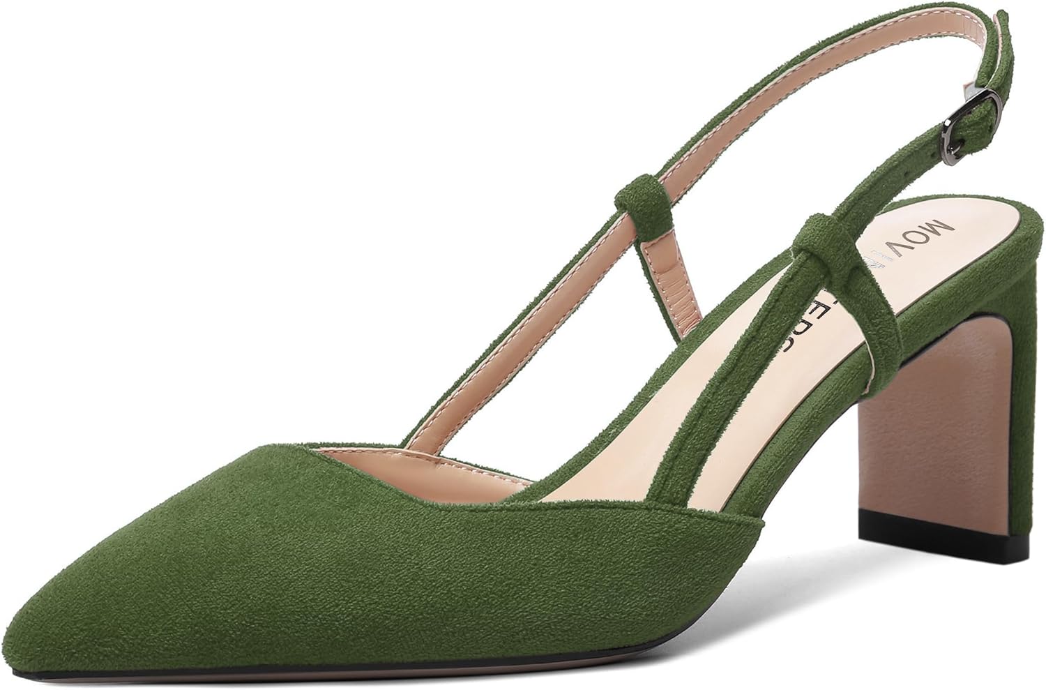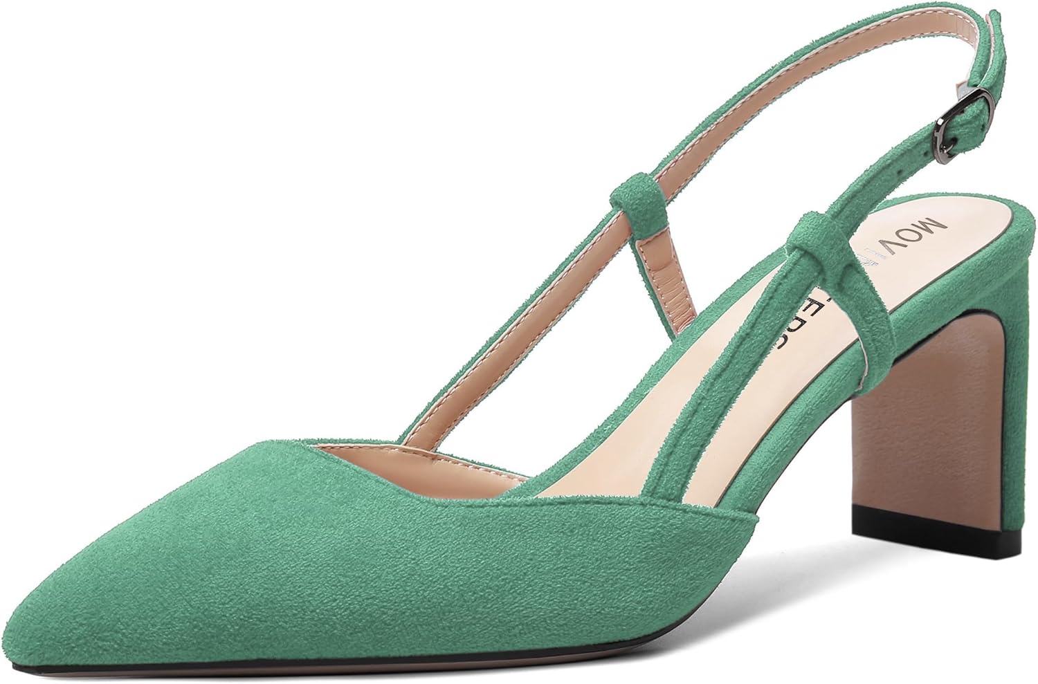 MOVINSTEPS Womens Solid Cute Night Club Buckle Pointed Toe Slingback Suede Chunky Mid Heel Pumps Shoes 2.5 Inch
