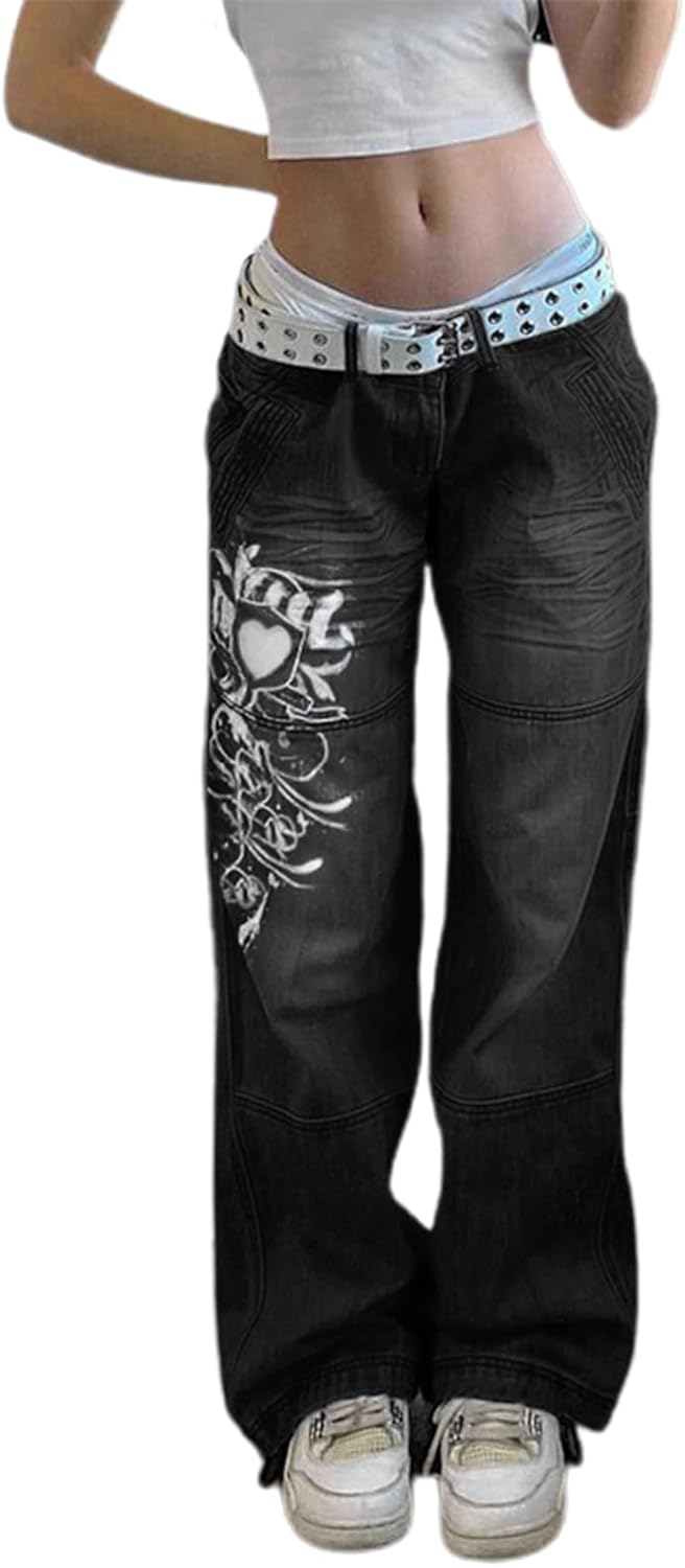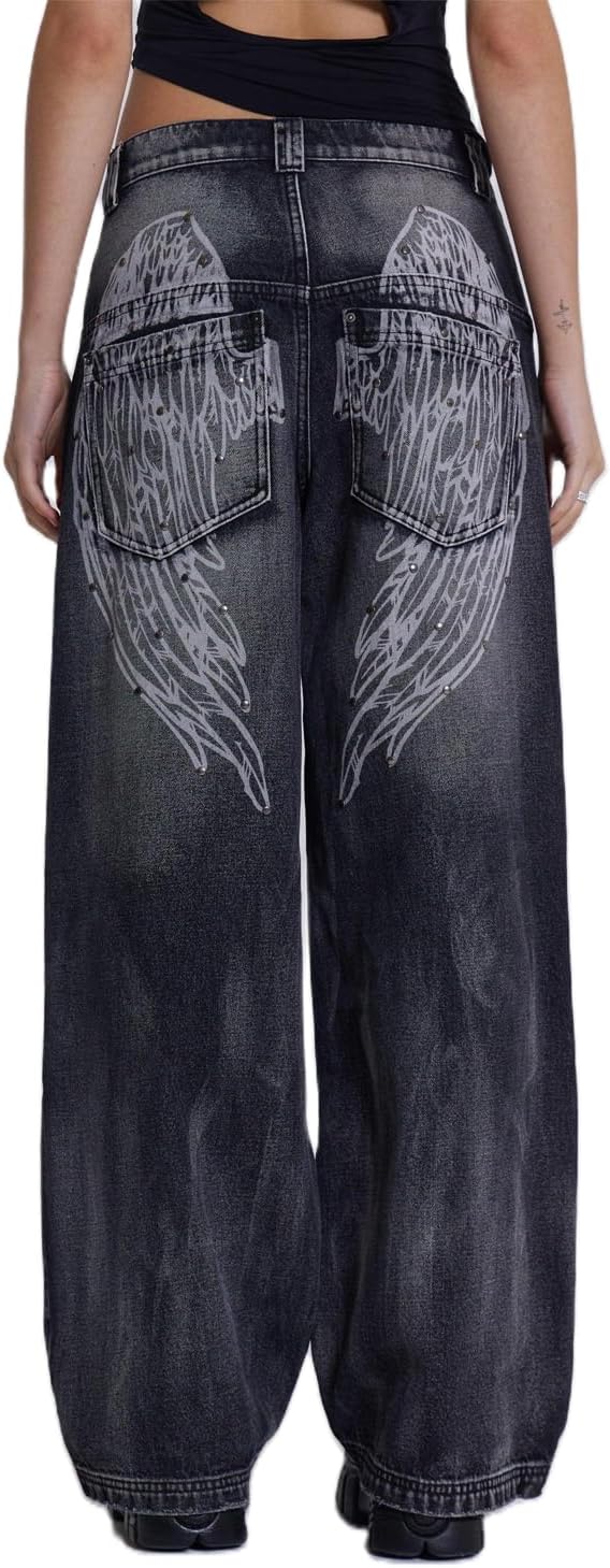 Cute Jeans for Women Fairy Bow Print Wide Leg Denim Pants Y2k Baggy Straight Leg Jeans Casual Mom Jeans Streetwear