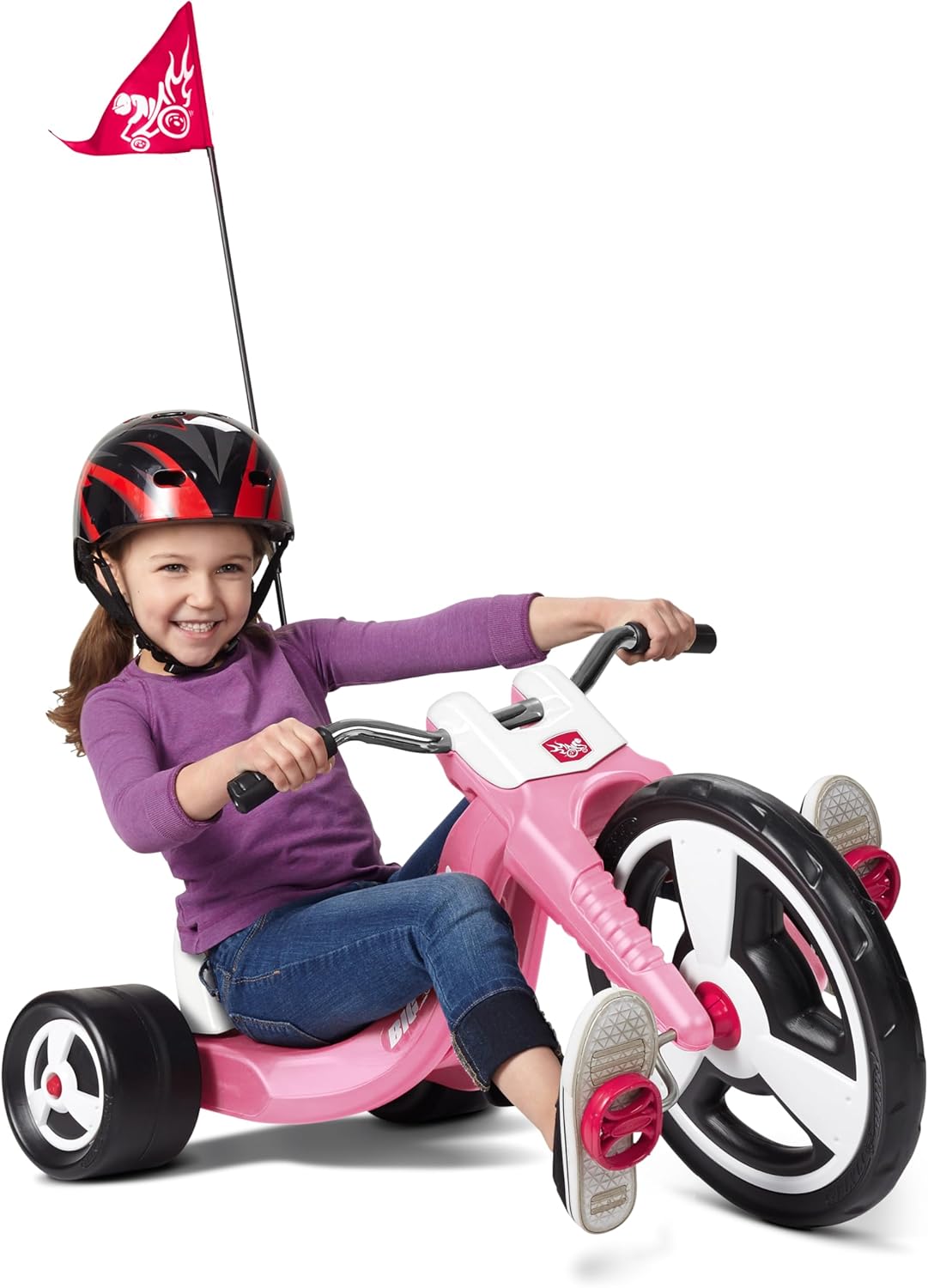 The Radio Flyer Big Flyer Sport is a chopper-style tricycle built for thrilling fun and confident control. A 16-inch performance front wheel reduces spinouts for smoother rides, while the low, sleek stance and chrome handlebars provide smooth chopper style for every ride. The adjustable seat grows with riders from ages 3-7, and the removable racing pennant adds visibility and flair. Perfect for sidewalks, driveways, and outdoor adventures, this kids trike provides years of memory-making fun. 65 lb maximum weight capacity. Radio Flyer is a Certified B Corp dedicated to durable products that inspire active play and warm family memories.