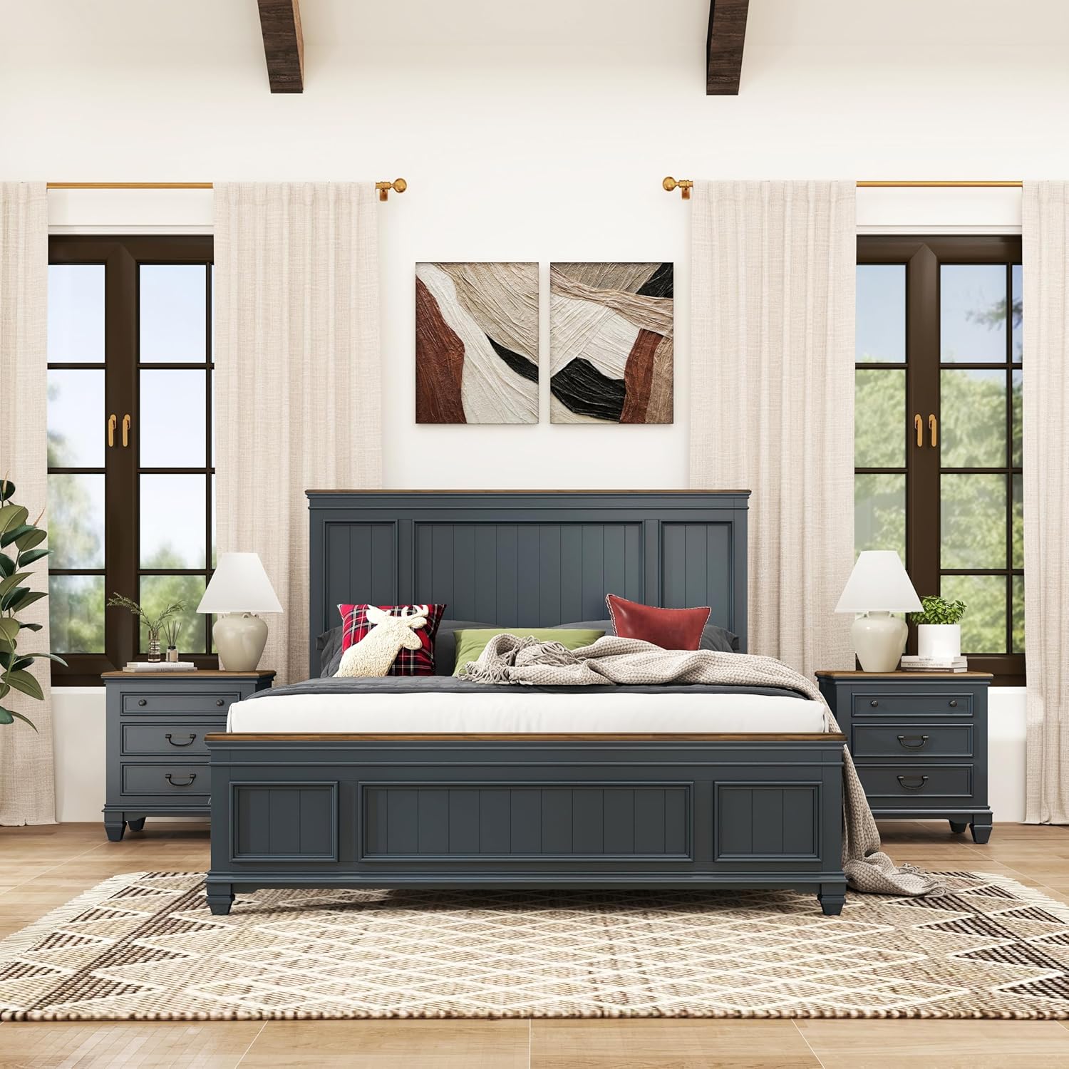 Transform your bedroom into a haven of rustic elegance with the Riverton Wood Bedroom Set. This comprehensive set includes a panel bed and 2 nightstands, all crafted from solid tropical wood with particle board laminate and Okoume veneer for durability and style. Choose from weathered white with dark gray or slate blue with honey oak finishes to suit your taste. The five-step finish and protective lacquer top coat enhance the distressed detailing and carved trim. Black-finished hardware adds a modern touch, while English dovetail drawer construction and full-extension metal ball-bearing glides ensure smooth operation. Perfect for a farmhouse-inspired retreat, this set combines timeless charm with practical features.