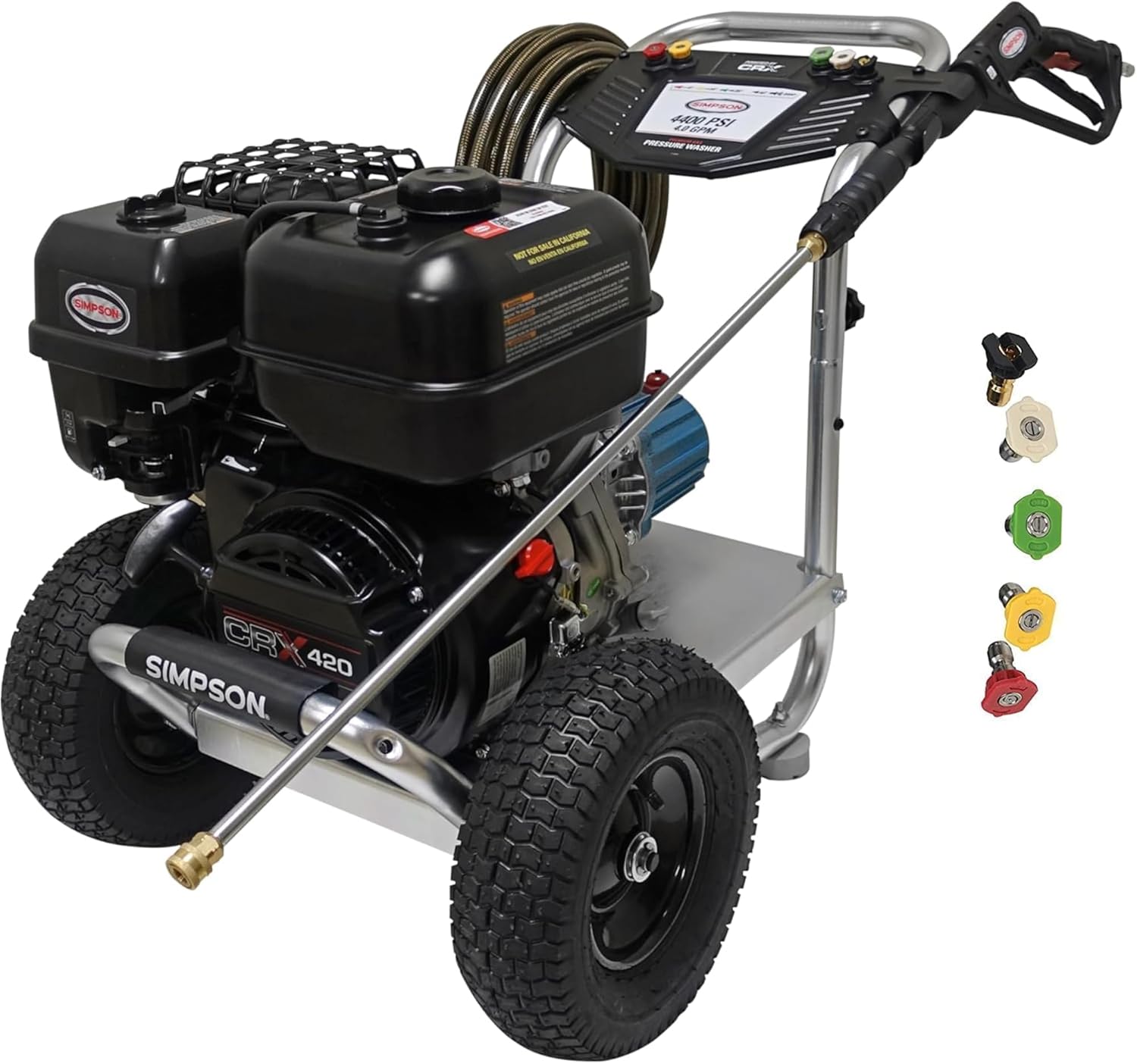 The SIMPSON Aluminum Series pressure washer 4200 PSI at 4.0 GPM is great for construction, equipment upkeep, and facility and fleet maintenance cleaning. With a powerful HONDA GX390 engine, reliable CAT triplex pump, and ultra lightweight aircraft grade aluminum frame, this pressure washer is the optimum blend of maneuverability and performance. The ALH4240 also comes with a 50’ hose, ergonomic spray gun, and 5 Quick Connect nozzles. Designed to meet the rigorous demands of the cleaning professional, the SIMPSON Aluminum Series frame is crafted of 100% aircraft grade aluminum, making it lighter in weight than most steel frame pressure washer designs. Perfect for contractors who specialize in deck cleaning, wood restoration, paint preparation, graffiti removal and all other professional cleaning services. The SIMPSON Aluminum Series designed for optimum performance in the harshest environments. Easy-to-assemble and easy-to-start, the Aluminum Series power washer is great for contractors who specialize in deck cleaning, wood restoration, and all professional services. 10 Year Limited Frame Warranty, 5 Year Limited Pump Warranty, 3 Year Limited Engine Warranty. Includes: Pressure Washer, Hose, Gun, Wand, 5 Quick connect nozzle tips, Detergent siphon tube with filter, Engine Oil, Quick start set up guide, Owner's manual.