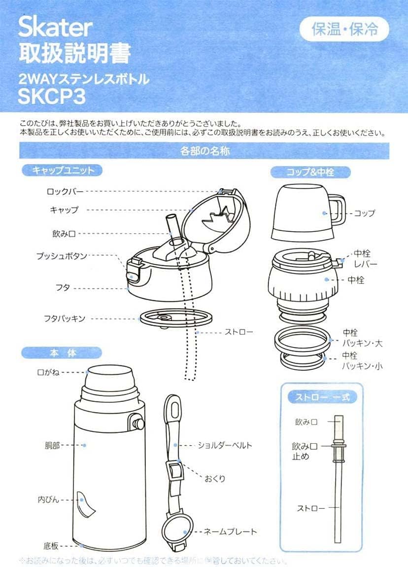 2-way type that can be used for drinking a straw or a cup Straw mouth water bottle made of durable and crystal clear PET resin. Perfect for practicing drinking with straw mouth The cap lock design prevents the cap from coming back when drinking, making it easy to drink. Easy and easy push-button opening Lightweight and compact, so it is easy for children to carry around. Shoulder strap and name sticker included. Cushioning on bottom to cushion impact A cup is recommended for hot beverages. Not dishwasher or dish dryer.