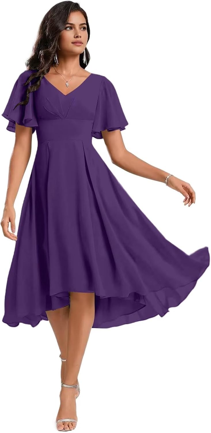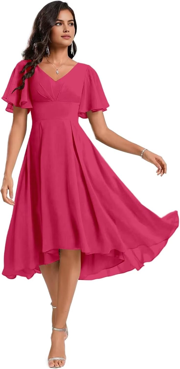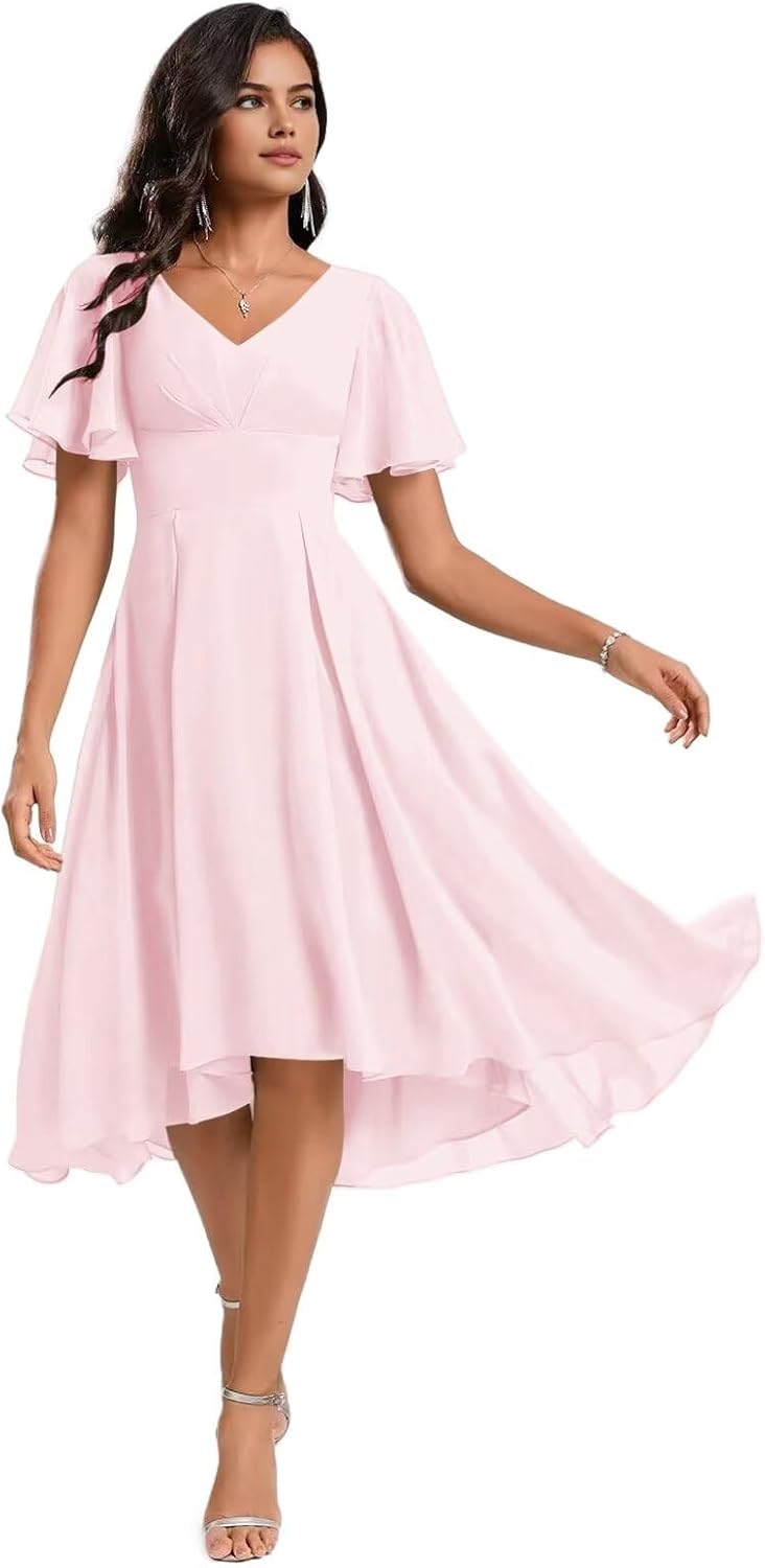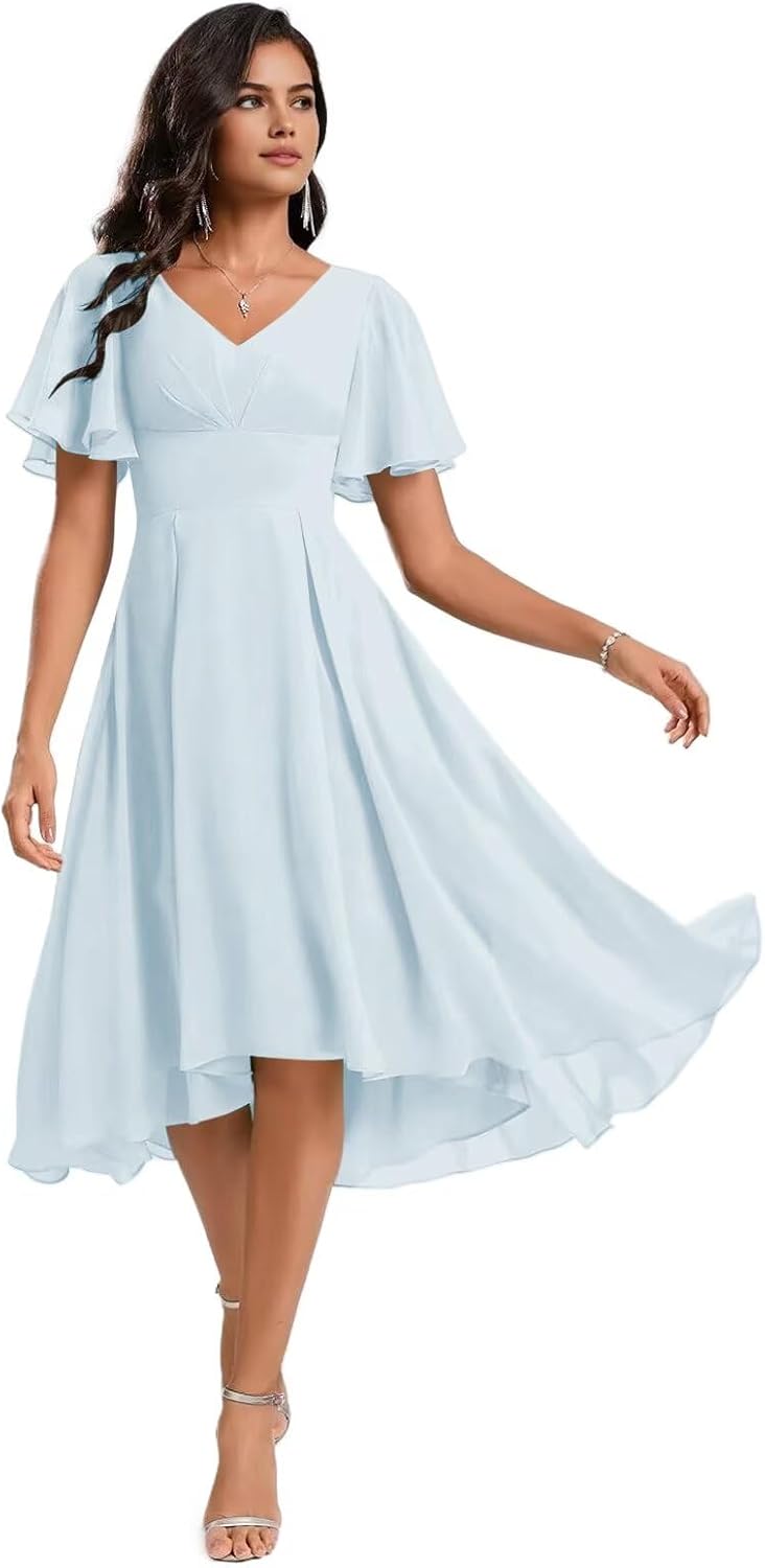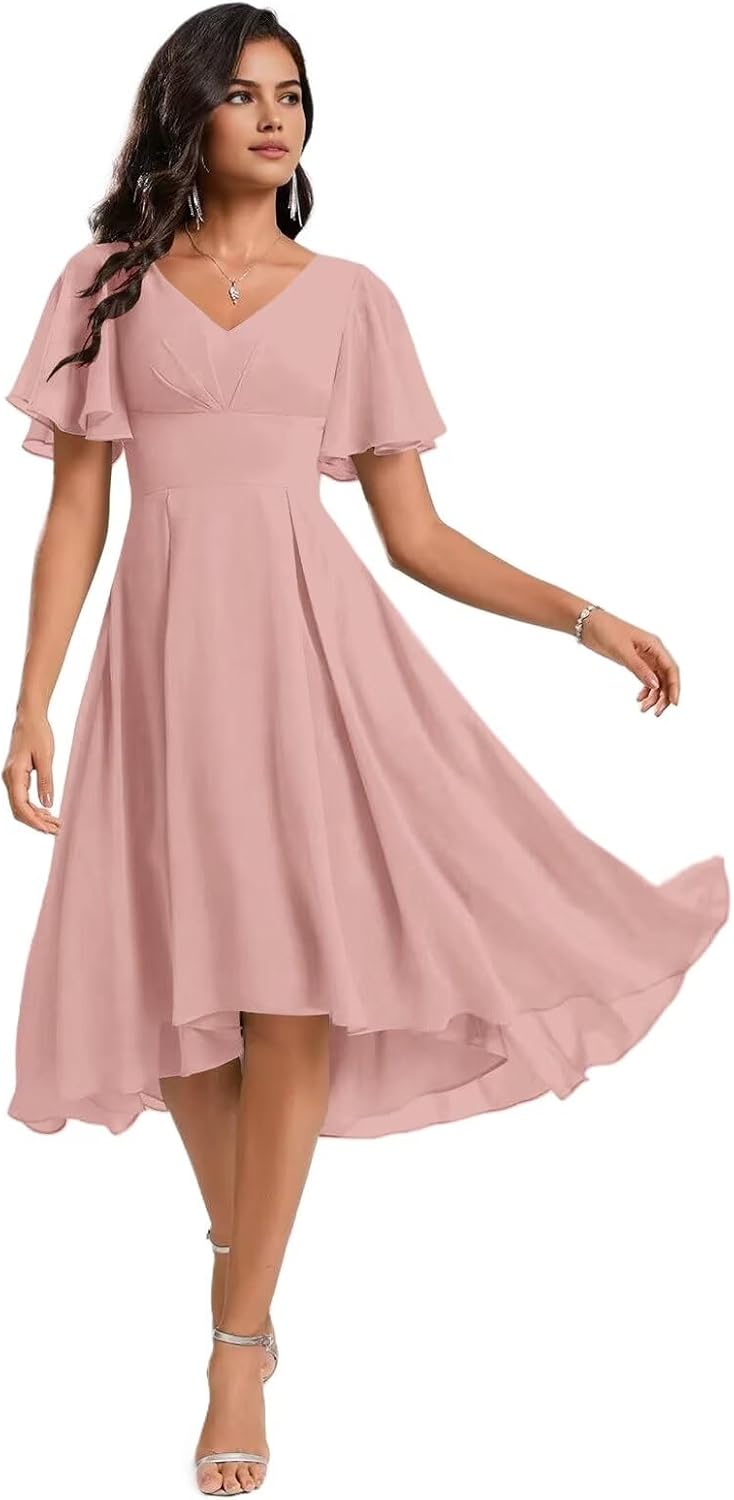 Welcome to SNOWROSE!Product Features: Fabric: Chiffon Sleeve Type: Short Sleeves Silhouette: A-Line Length: Knee Length Neckline: V Neck Closure: Lace-up Back Size Guide: Measure your body and compare it with our size chart. If you want a more accurate fit, please provide us your measurements as follows: 1. Bust___inches 2. Waist___inches 3. Hips___inches 4. Hollow to floor ___inches 5. Height (without shoes)___inches 6. The date you need the dress:____