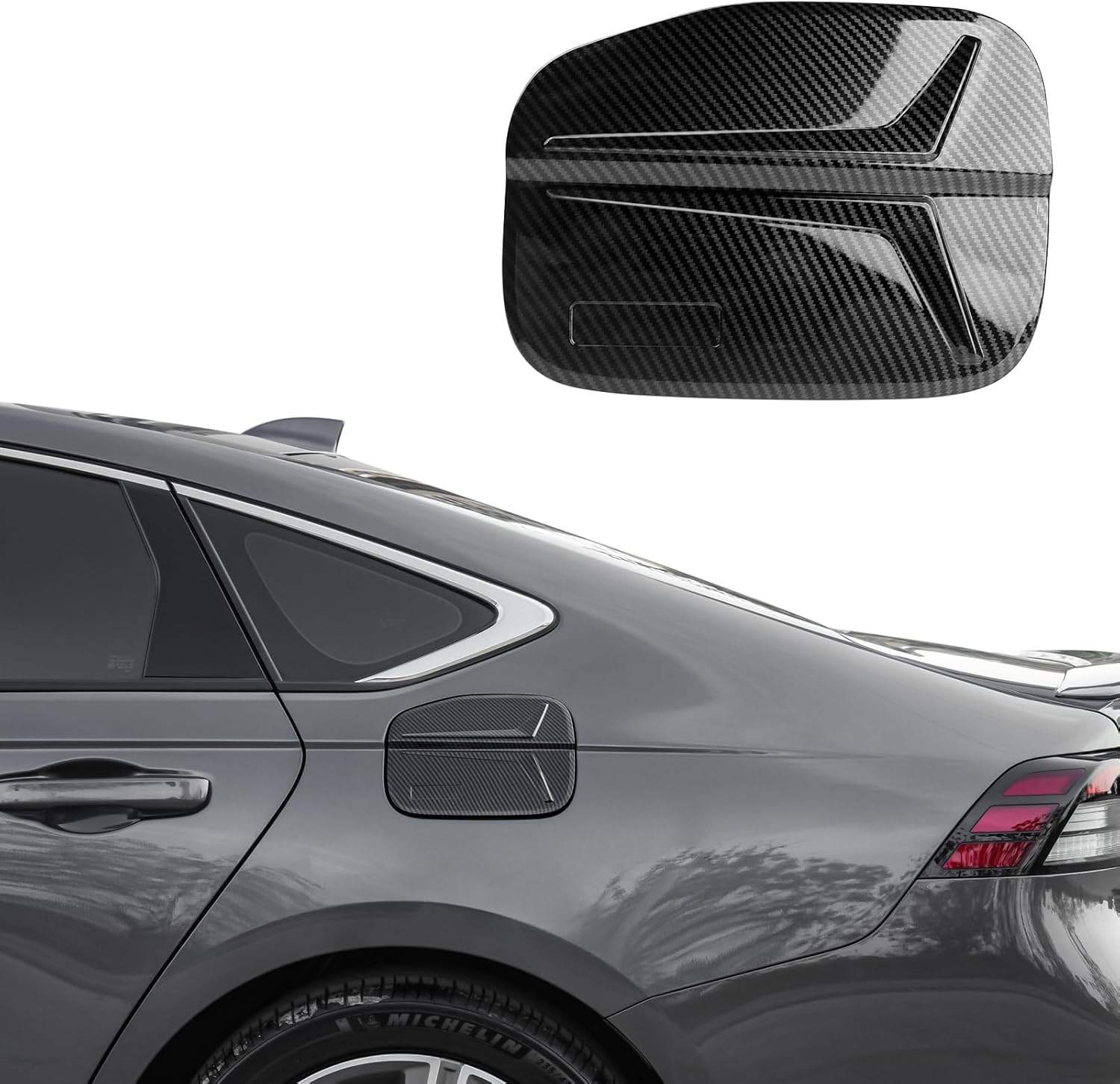* Installation: Easy to install with adhesive tapes, no damage to your car. Clean your car before installation and heat the tape a little for better adhesion. Then stick the cover to the gas tank door and press for 1 min.