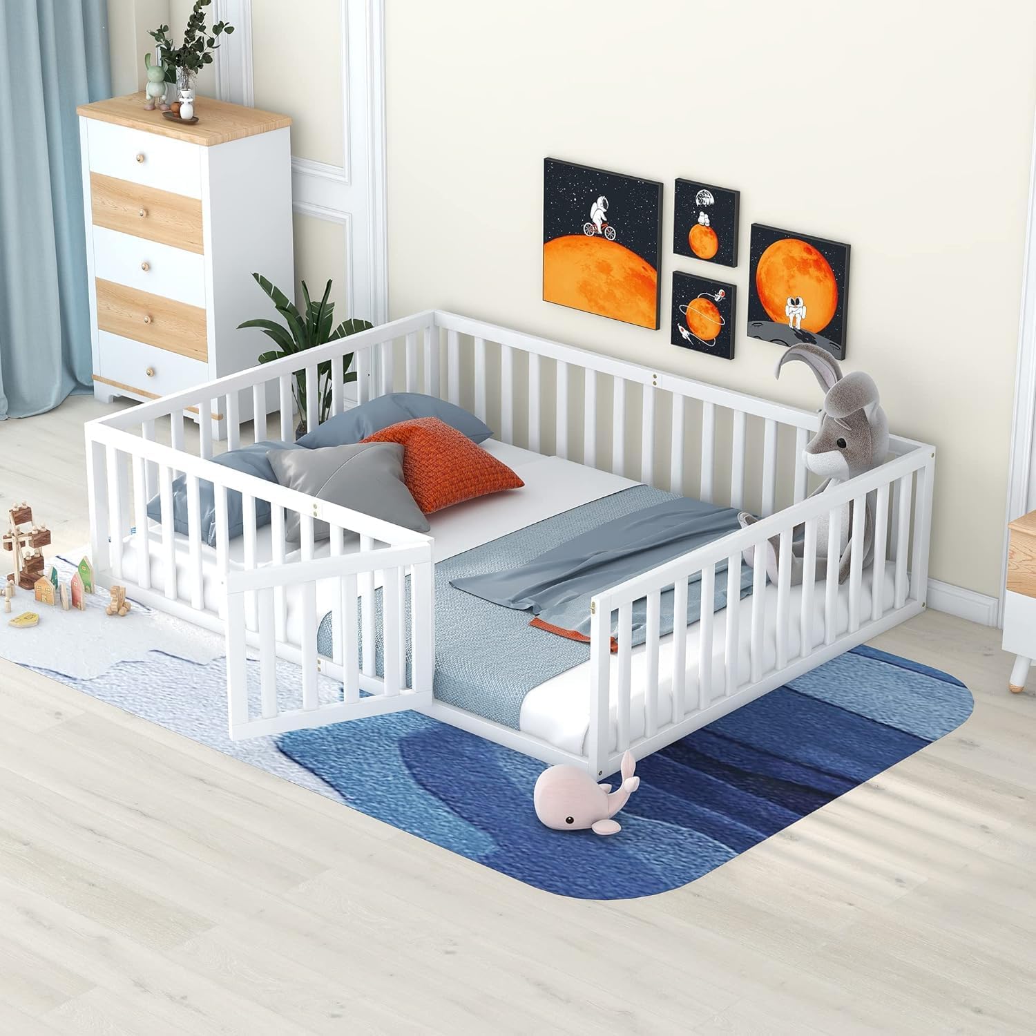 With elegant and simple and graceful pattern design, this floor bed with a door brings artistic atmosphere to your home. Small door that can be opened and closed increases the interest of the bed and create more safety sleeping space. This floor bed frame is designed with a clean silhouette and a hue of elegance. It suits all styles of home decoration, and completes the look of any kids bedroom. Weight & Dimensions Overall Product Dimension: 77.2"L x 41.3"W x 21.6"H Detail Product Dimension: Please refer to the Size image Number of Package: 1 Overall Product Weight: 33 LBS Package Size Length (in.) 44.09 Width (in.) 24.21 Height (in.) 7.87 Weight (lbs) 38.58 Weight Capacity: No limited Recommended Mattress Thickness: 8" Specifications: Product Type: Floor Bed Size: Twin Color: Gray Material: Plywood+MDF+Pinewood Number of Slats: No Slat Assembly Required: Yes Country of Origin: Vietnam Product Warranty: One year