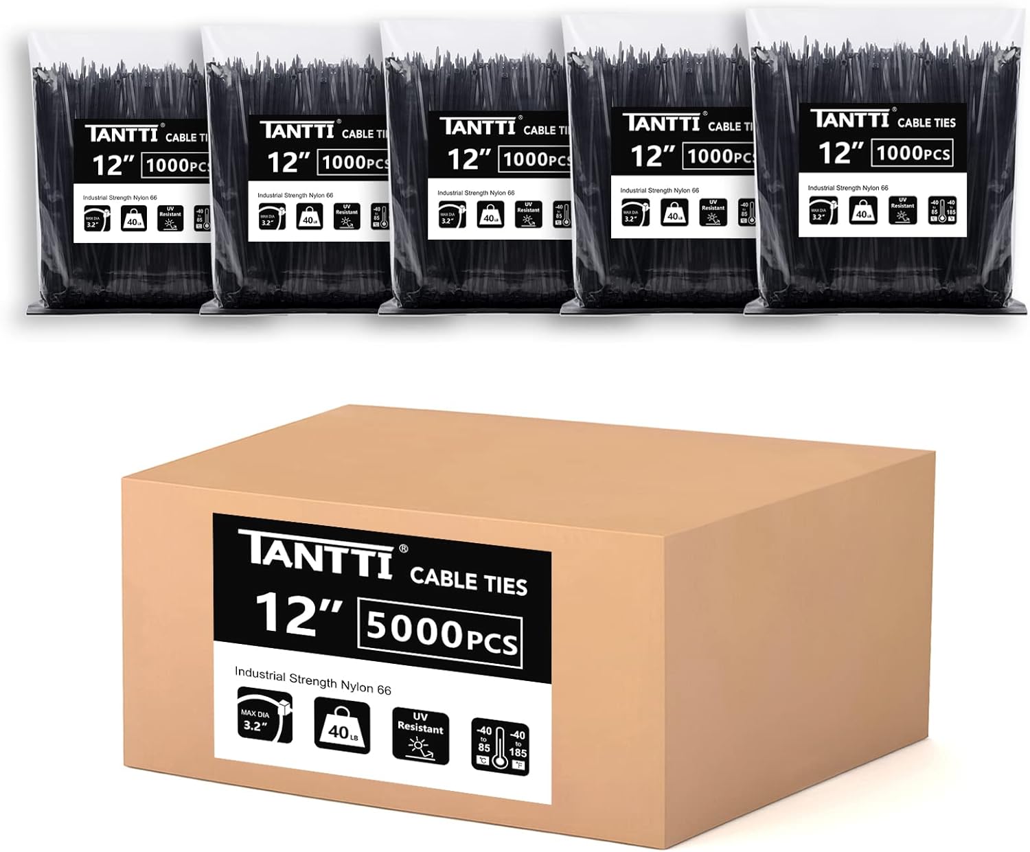 Black Zip Ties 8 inch 1000 Pack Tantti Co.,Ltd is a professional manufacturer of nylon cable ties. We will continue to improve the product quality, provide top grade products and the best service for our customers. Make the best use of your purchase! With 1000 zip ties in each package, you don't have to worry about running out in the middle of your project. High Quality Tantti black zip ties are made of UV resistant halogen free nylon 66. Operation temperature is -40℉to 185℉with UL94V-2 flammability. Higher Tensile Strength The tensile strength of our zip ties is 50 pounds, higher than others. Tantti zip ties’width is 0.14 inch, wider than industry standards. You can use our wire ties with confidence without worrying they will break. Self-locking Design Tantti zip ties can be easily locked in, tightly and securely. One-piece construction for consistent performance and reliability. Multi-purpose Applications Tantti plastic ties can be used to tie cords and cables for electronics. 8 inch zip ties can be used to organize electrical wires and PC or laptop cords. You can use them to repair garden fences, hang LED lights, etc. Warranty: Tantti zip ties have a 1-year warranty period. Our customer will receive a 100% refund if any quality issues under warranty period. Tips: 1. Please keep out of reach of the children. 2. Please use a scissor when you remove the tip of zip tie. 3. Please use zipties in proper temperatures and tensile strength. Package Includes: 8 inch Zip Ties Black 1000 Pack.